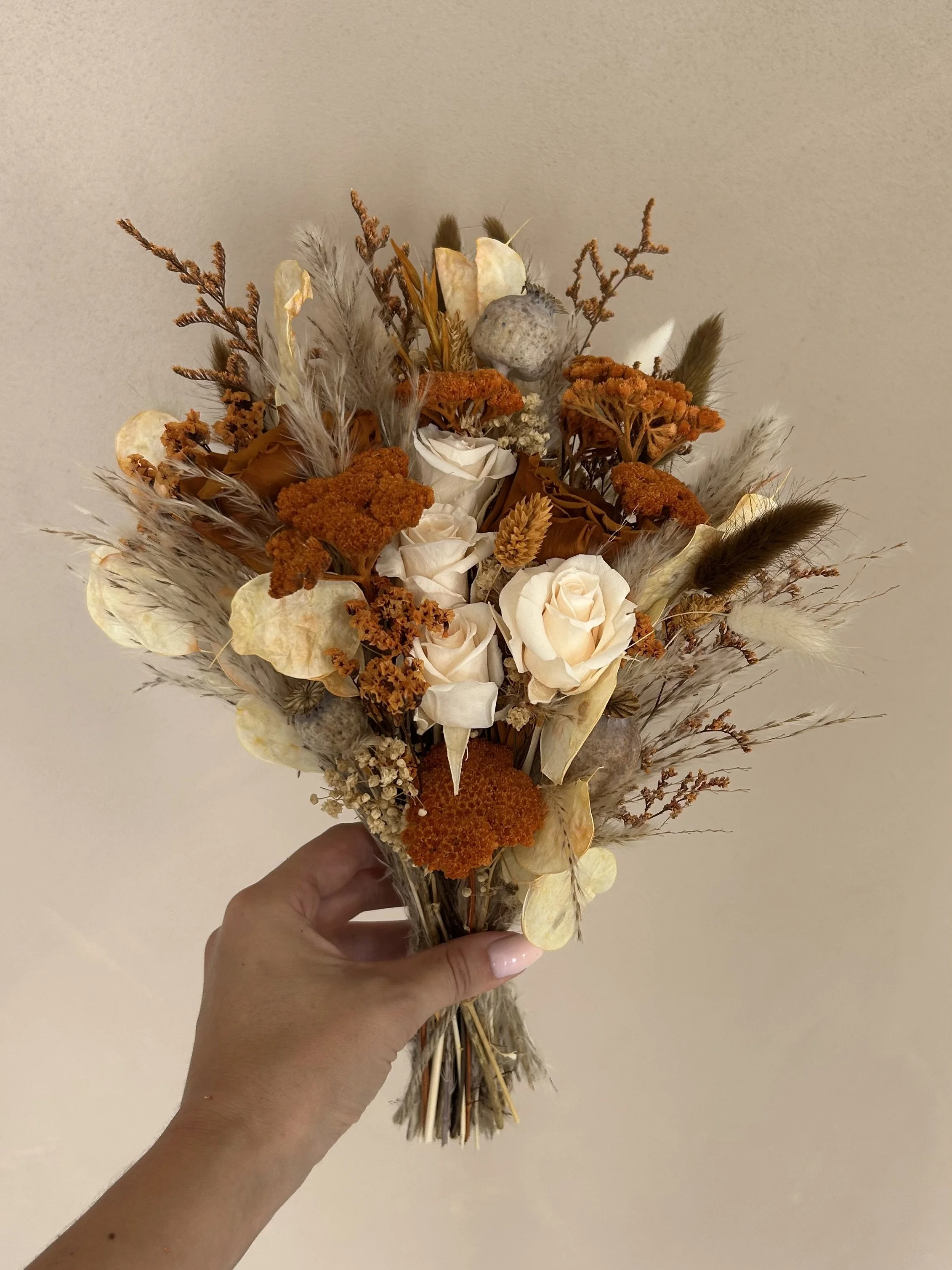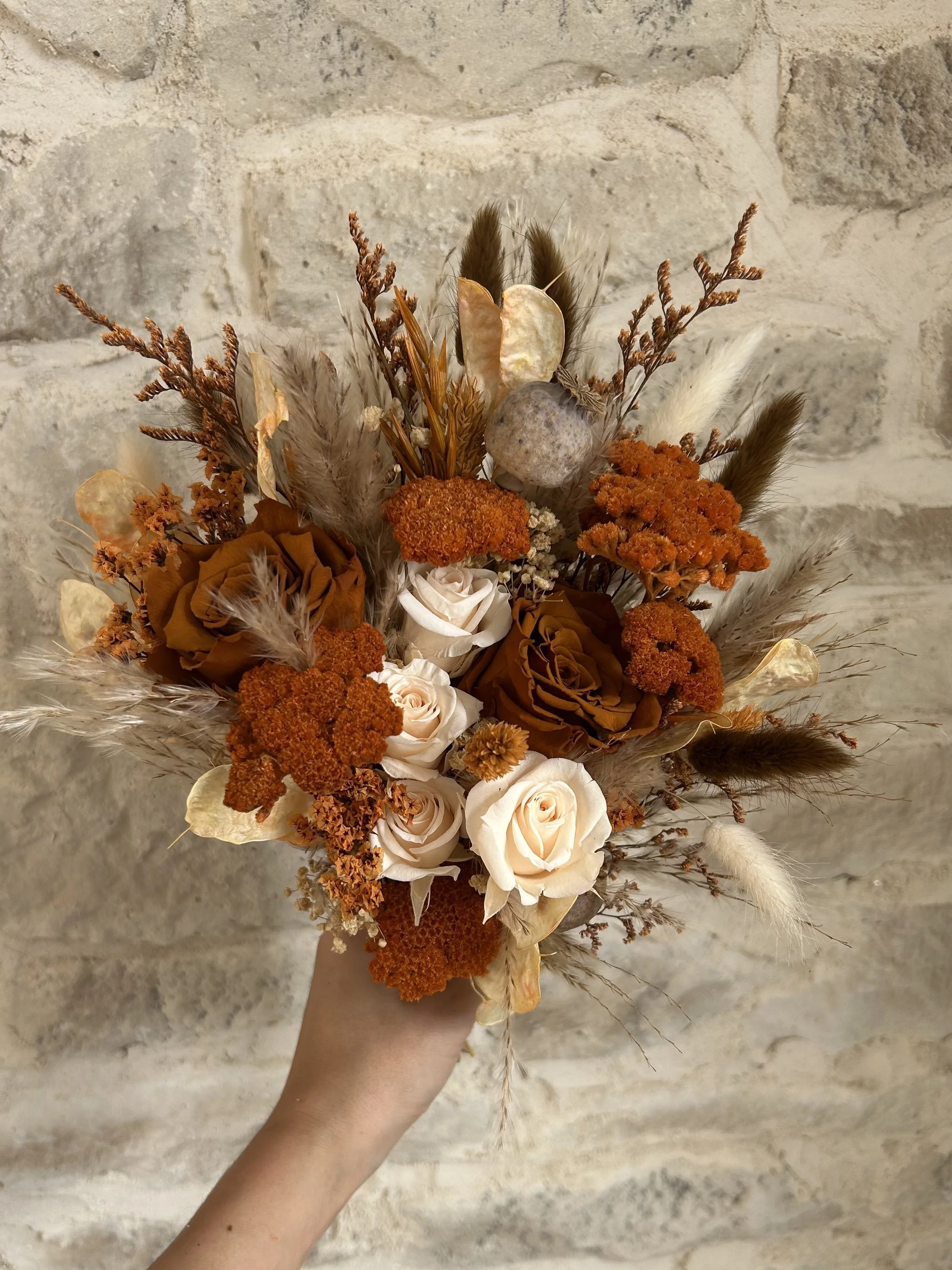Le bouquet Terracotta est composé de plusieurs variétés de fleurs séchées et stabilisés dans les tons orange, champagne et marron.