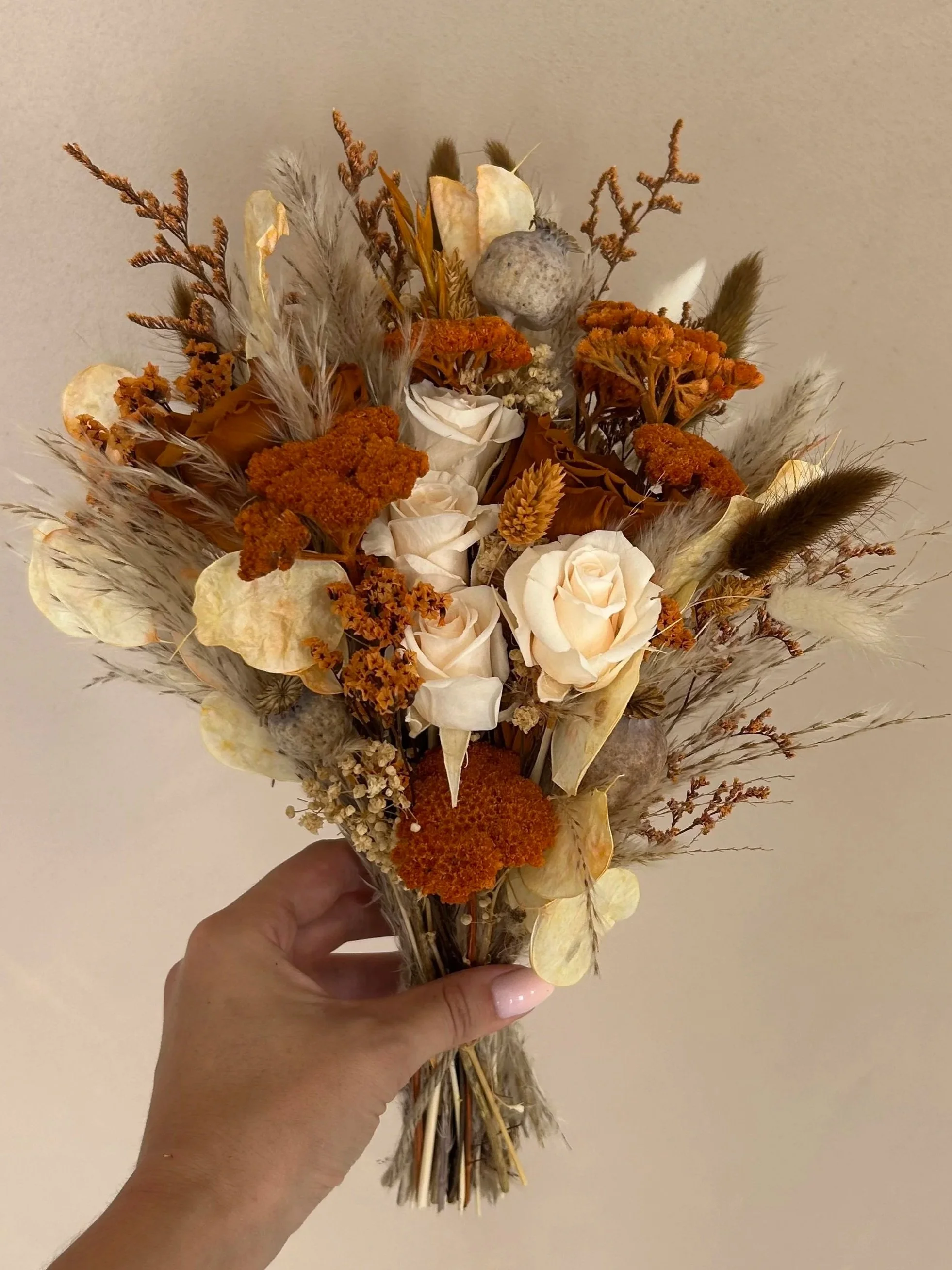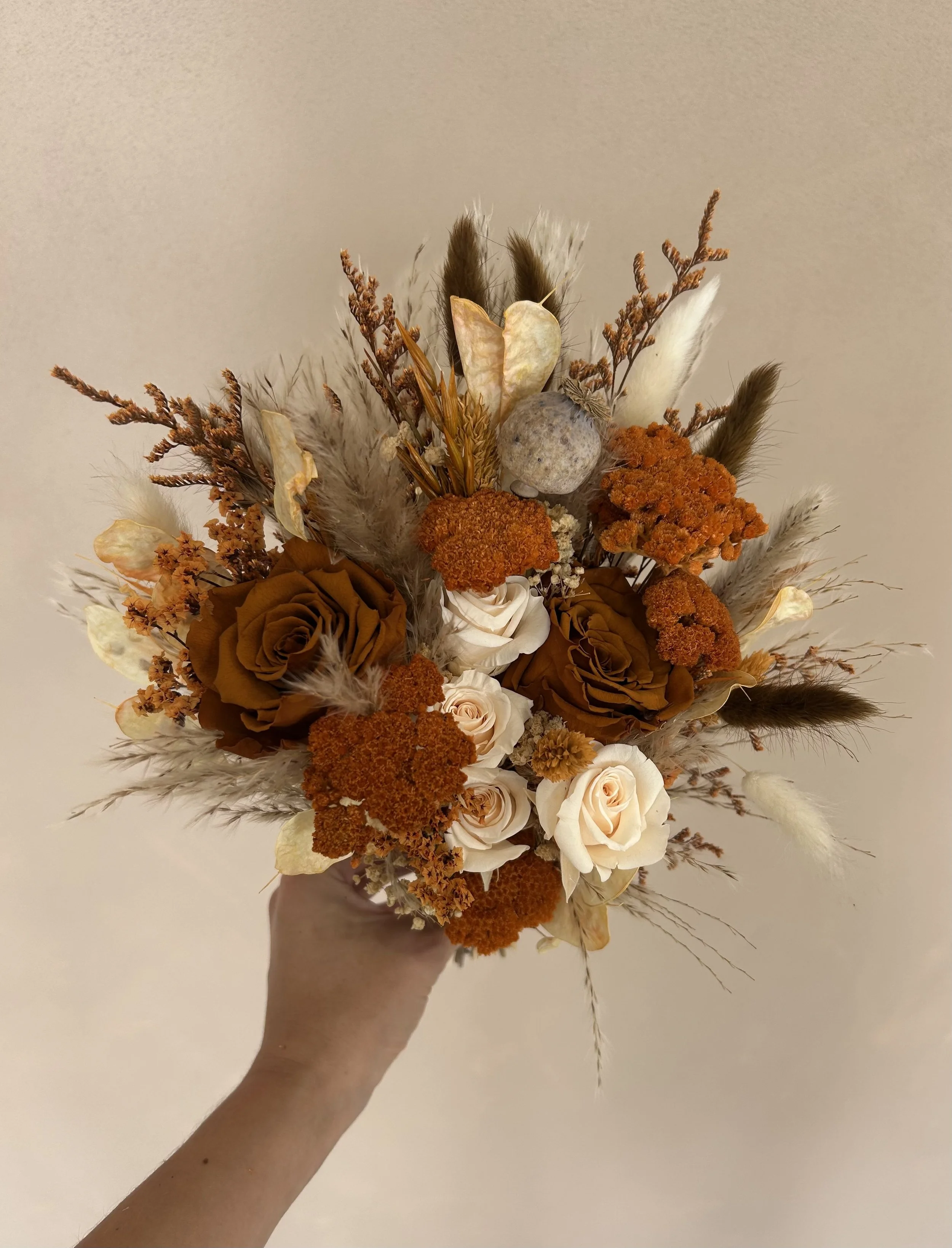 Dans la collection mariage Terracotta, on retrouve plusieurs variétés de fleurs séchées et stabilisées dans les tons terracotta, orange et marron : notamment de la rose, de l’achillea, de la monnaie du pape, des coquelicots…